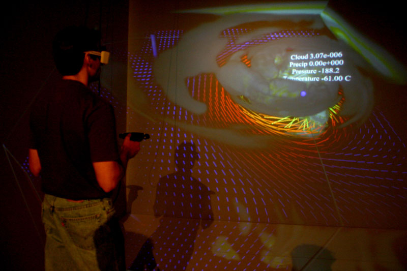 We developed an immersive prototype application, AtmosV, developed to interactively visualize the large multivariate atmospheric dataset provided by the IEEE Visualization 2004 Contest committee. The visualization approach is a combination of volume and polygonal rendering. AtmosV was derived from the Immersive Drilling Planner, a visualization and planning tool for oil and gas wells, also developed at the BP Center for Visualization. The development team consisted of Kenny Gruchalla and Jonathan Marbach, both Ph.D. students in computer science at the University of Colorado. The immersive application was developed and evaluated on both a shared-memory parallel machine and a commodity cluster. Using the cluster we were able to visualize multiple variables at interactive frame rates.