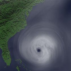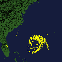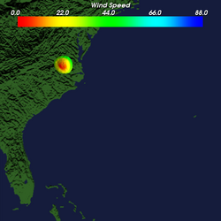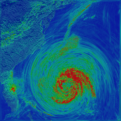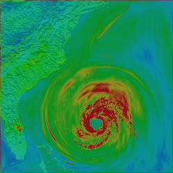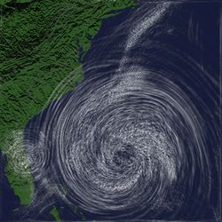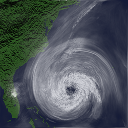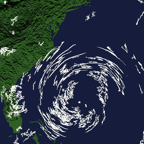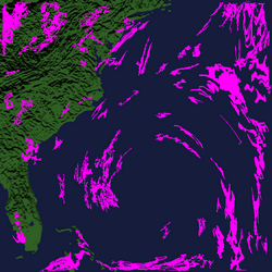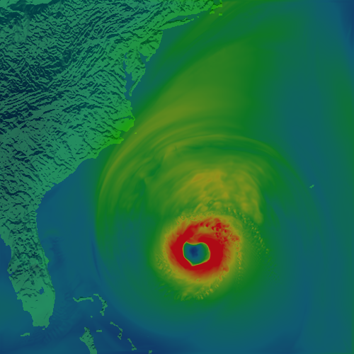 The figures below show the results from applying the emission only and maximum projection to time step 8 of the dataset. The top figure shows the results for the velocity magnitude. The hotspots correspond to regions where there is high wind speed. The middle figure shows the results for the vorticity magnitude. The hotspots correspond to regions where there are large amounts of local rotation -- this can be useful for interpreting where the hurricane is likely to be most destructive. To reinforce this notion, the bottom figure shows the results for the complex eigenvalues of the velocity gradient tensor. The emission only image shows two sets of spirals: the larger one surrounding the hurricane eye, and the smaller one surrounding the hotspots arising on top of Florida.