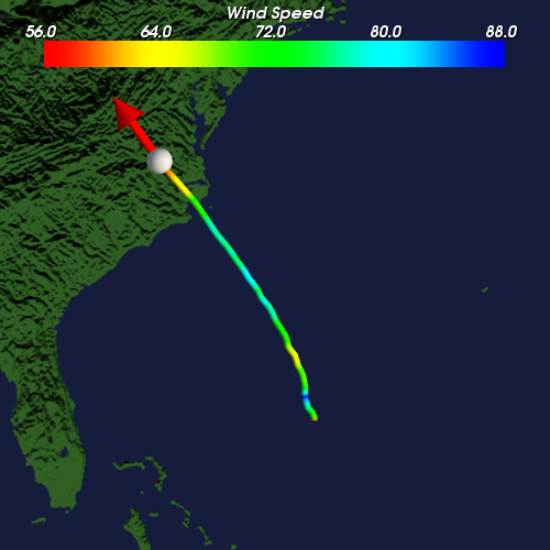 The left figure below shows the results from applying this framework to the dataset at time step 48. An isosurface is extracted for the low pressure; the surface is colored using the velocity magnitude. What's unique about this framework is that it can correctly identify the central region of the hurricane without introducing any artifacts. The right figure below shows the results from performing hurricane tracking after automatically identifying the central region of the hurricane for all time steps. Iconic visualization is used to illustrate the path of the hurricane, the eye of the hurricane at each time step (the spheres), the translational velocity (the arrows), and the maximum wind speed (the colors).