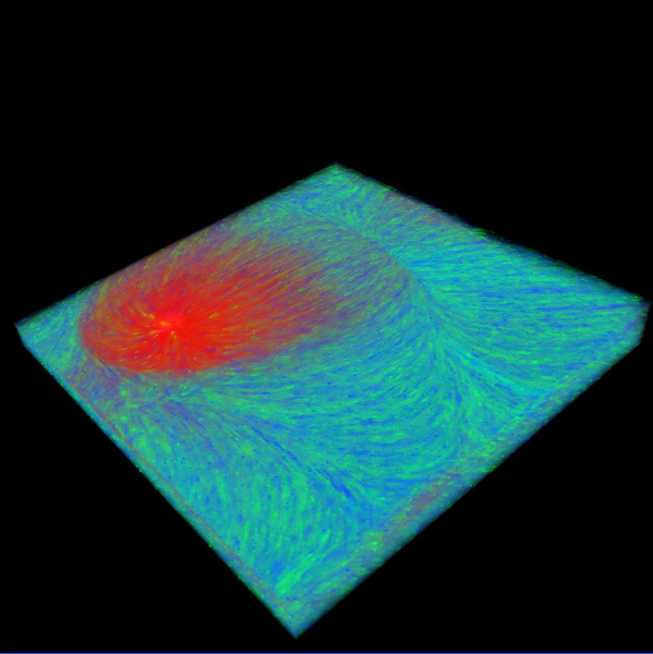 3D Texture Advection + additional red Dye: 2 Materials (blue and green) are advected time-dependently using a normalized vectorfield.