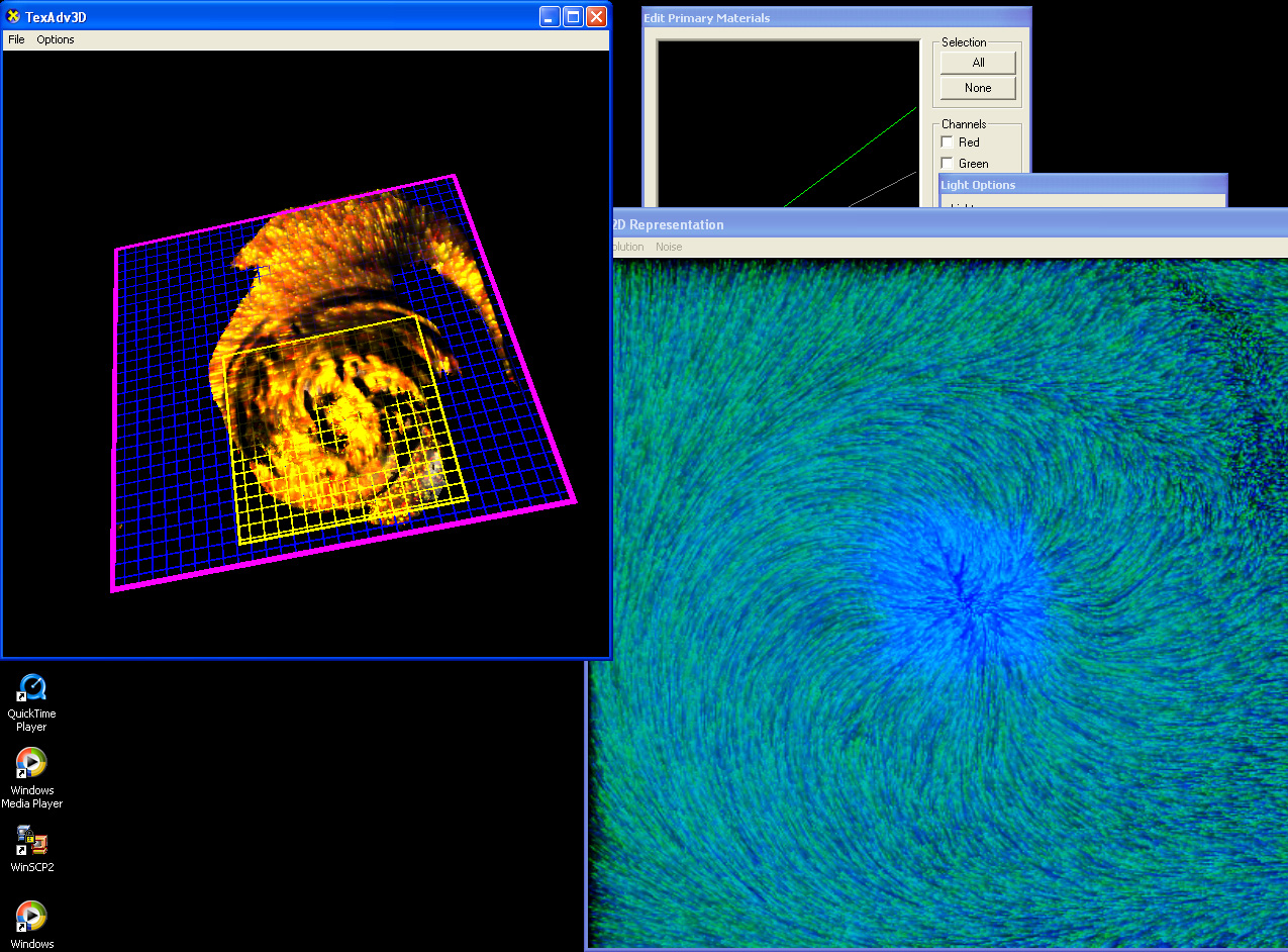 Performance measurements for a Windows XP machine with an ATI Radeon X800 GPU (256 MB). The sizes of the vectorfield are stated in the first column. The generated image size is 600x600 pixels, the internal color depth for the Advection step 16 bit/channel=64 bit and the color depth for the final display 8 bit/channel=32 bit. A subsampled data of 256 x 256 x 64 maximum is considered.
