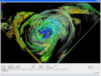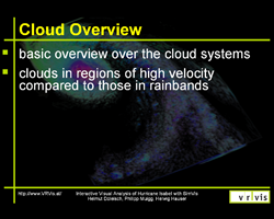 After the specification of those two features the exploration through the time dimension can easily be accomplished by stepping through the single timesteps in the 3D view. Now that a basic understanding of the cloud structures has been gained, further analysis can be carried out by focusing on the question if clouds can be found in regions of high flow velocity. This can be achieved by simply selecting portions of the data set that contain high velocity and clouds. Furthermore the velocity is mapped to color in the 3D view. Again by stepping through the time dimension, further insight into the data can be gained. It can be shown, that the clouds surrounding the center of the hurricane are within regions of extremely high velocities. What can be witnessed as well is a cloud gap in this thick wall of clouds about 34 hours after the start of the simulation, that will be discussed later on in more detail. After examining those clouds near the center an overview over other cloud portions in calmer regions of the dataset can be made by now selecting clouds in cells exhibiting low flow velocity. This selection now clearly shows the rainbands that form around the hurricane at three different fronts which will be discussed in another video more closely. Those clouds can be classified as Cumolonimbus, which exhibit the typical towering structure with a slight overcast. |