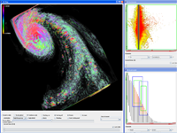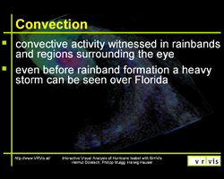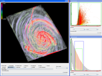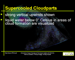 By examining the time dimension the very early generation of a storm cell over Florida can be witnessed, which takes place even before the main rainbands evolve. Furthermore, this visualization shows very strong convective bands spiraling out from the center of the hurricane (and to a lesser degree from the storm over florida). During our investigation we did not find any phenomenom matching those bands. Still we wanted to mention it, since those bands are so easily recognizable. In order to gather more insight into the convective activity of the hurricane near its center we again refined our selection by brushing only cells within a certain spatial location which resulted in the selection of a slice of the dataset. By moving the brush in the lower right scatterplot the position of this slice can be changed interactively. Additionally regions of high velocity are selected and thus only areas outside the eye can be examined. In this visualization the cause for the gap in the clouds that was mentioned in the description of the first video can be seen quite clearly. Air is flowing downward in a very narrow channel and thus hinders cloud formation at this part of the hurricane. Besides this, multiple small convective cells can be seen in the selected slice right next to the eye wall. |