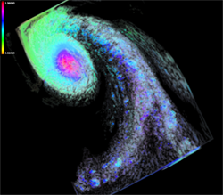 Furthermore we made several additional datasets containing the same attributes but only one single timestep at a resolution of 250x250x50 to produce the images that can be seen below. The rendering of those datasets was still interactive at a framerate of approximately 15 frames per second. The video capturing software (Camtasia Studio) that was used to grab the screen during the visualizations ran in the background on the same PC and was not able to grab all frames that were displayed in the 3D-rendering view. Thus the framerate during interactions shown in the video is far less than the actual performance of the system. On average around 45 frames per second can be achieved in the subsampled dataset that was used for the interactive demonstration. The update after a data selection change is roughly 0.5 seconds. |