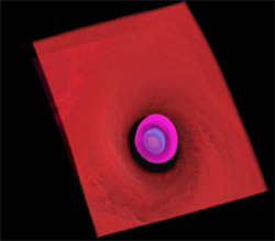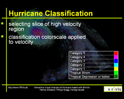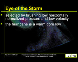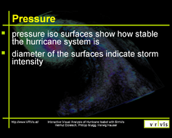 The extremely low central pressure within the center of a hurricane is, like its eye, another very impressing characteristic of such storm systems. In order to visualize this we made several small selections in the pressure data attribute to generate the impression of iso-surfaces. By stepping through time the extreme stability of this low pressure system can be witnessed. | ||||||