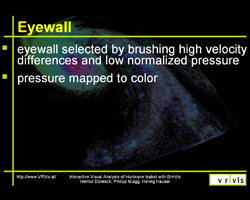 The eyewall is the border between the calm eye and its inhospitable surroundings. To extract this border from the data we had to spatially derive the wind velocity in a preprocessing step. Next we selected portions of the data that were in regions with low horizontally normalized pressure and exhibit high spatial velocity differences. | ||||||
