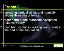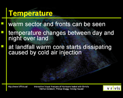 The temperature from ground level to about one km height prooved to be the most interesting in the course of our exploration, since the most information can be gained from it. Firstly, this video shows how the degree of interest is focused on relatively warm and relatively cold portions of the data in the lowest slice of the dataset. Then the time dimension is analyzed timestep by timestep. This visualization clearly shows the warm sector, the leading warm front, and the following cold front of the storm system. Furthermore, the weak warm front and its slow dissipation north of the storm can be witnessed. Besides those findings it can also be seen that the air over land is cooling rapidly at nightfall and is warming up only slowly on the next day. Furthermore the injection of very cold air into the storm system at landfall quickly cools down the storm center. | ||||||