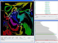 With this setup the flow within the dataset can be observed and overviewed conveniently. Vortices and saddle points can be located by looking for points where all six selected bands meet. In order to distinguish vortices from saddles, the order of the colors has to be considered. If a vortex lies around the point of interest, the different bands, which have to be viewed in a clockwise order, must be colored like the color scale downwards. To detect whether it is a cyclonic or anticyclonic vortex the location of the bands has to be checked. A cyclonic vortex, like the hurricane itself, always has its green band at the east while anticyclonic vortices have theirs on the west side. Every point of interest that is no vortex is a saddle. With this knowledge we examined the dataset and realized that there are some vortices and saddle nodes besides the hurricane itself. Those are rather weak and mostly confined to thin layers of the atmosphere. The only exception to this is a saddle node and an anticyclonic vortex that can be witnessed at about 13 km height. The saddle and the anticyclone seem directly connected to the main vortex of the hurricane and are also moving together as time progresses. |
